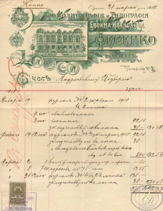 Уже через 10 лет после открытия типографии и хромолитографии Фесенко был признан образцовым первым типографом государства. А в дальнейшем ему было присвоено звание Почетного Потомственного гражданина Одессы.